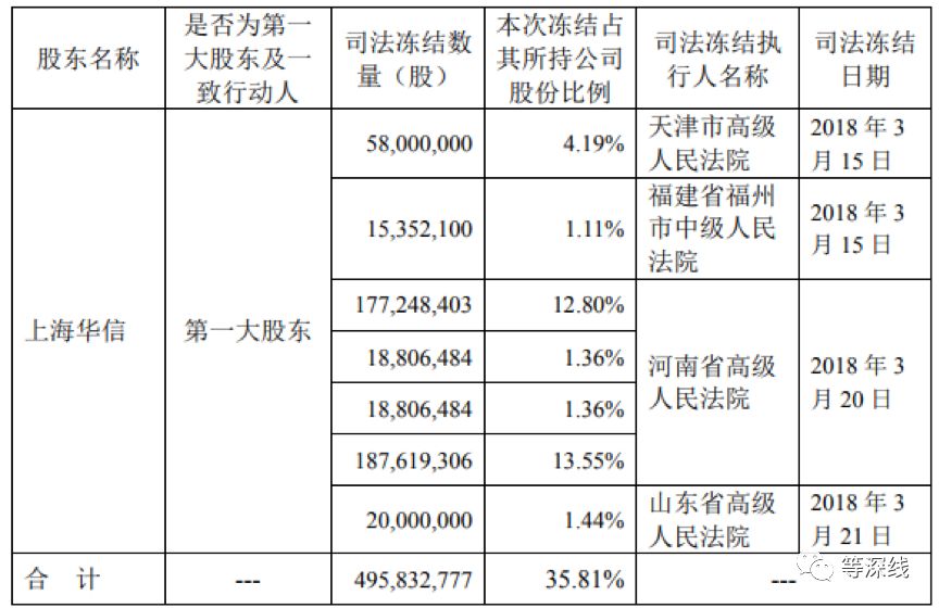 2018年3月30日,上市公司安徽华信国际控股股份有限公司(以下简称“华信国际”)发布了关于控股股东上海华信持有的部分股份被司法冻结的消息:上海华信所持股份累计被司法冻结495832777股,占其所持公司股份总数的35.81%,占公司总股本的21.77%。根据3月19日华信国际停牌价5.39元/股计算,本次冻结股份价值约为26.7亿元。