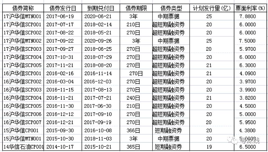 上海华信中期票据和短期、超短期融资券发行情况。《等深线》记者顾湘根据票据、融资券发行权威信息整理