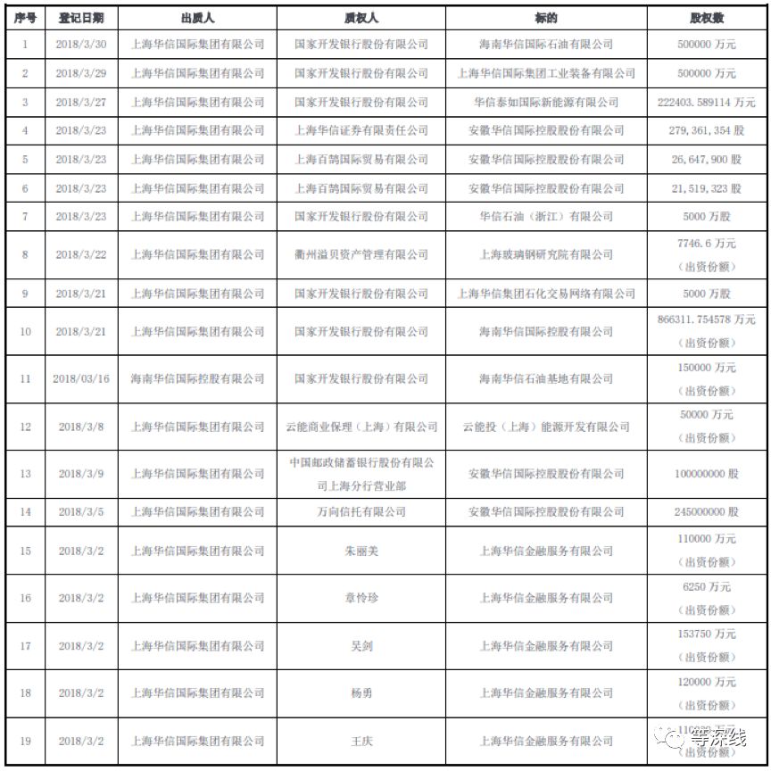 值得注意的是,2018年3月1日以来,上海华信及其子公司进行了多次股权和股票等资产的抵质押。