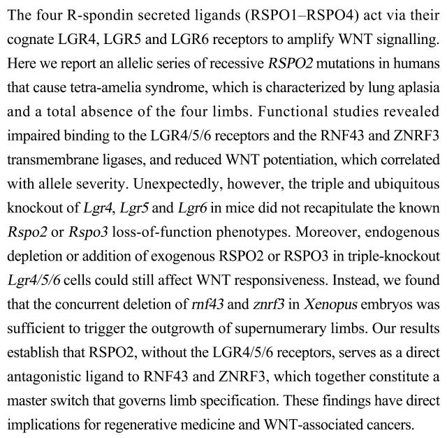 (导读:阿金)Rspo分泌性蛋白家族的4个成员(RSPO1–RSPO4)通过其受体LGR4/5/6放大WNT信号。本研究报告人类等位基因系列的隐形RSPO2变异导致先天性四肢切断症,三重敲除小鼠的LGR4/5/6并不致使Rspo2或Rspo3功能性丧失表型出现,而同时移除非洲蟾蜍胚胎中的 rnf43和znrf3则导致多余肢体的生长。该研究结果对再生医学和WNT相关癌症研究具有重要意义。