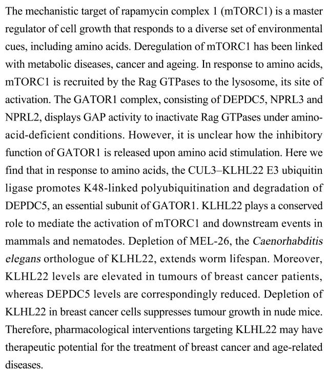 (导读 过泽远)在氨基酸等环境信号刺激下有如下通路发生:GATOR1复合体活性下调 - Rag GTP酶激活 - mTORC1被招募至溶解体并激活。该通路与多种疾病相关,但GATOR1复合体被初始信号抑制的机制尚不清楚。本研究发现在氨基酸信号下,CUL3-KLJL22 E3泛素剪接酶可促进GATOR1复合体组分DEPDC5的降解,从而抑制GATOR1。研究者在在哺乳动物和线虫中验证了KLJL22的这一功能,说明KLHL22可能成为相关疾病的药物靶点。