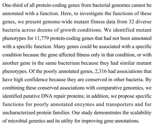 (导读 郭思瑶)细菌基因组中三分之一的编码蛋白质的基因还没有功能注释。科研人员为了探究这些基因的功能,鉴定了不同生长条件下11779个编码蛋白质基因的突变表型,通过对保守的联系基因关联进行比较基因组研究,获得了假定DNA修复蛋白、某些酶、转运蛋白和未知蛋白家族得到了的功能注释。该研究体现了微生物遗传学在基因注释上的应用。