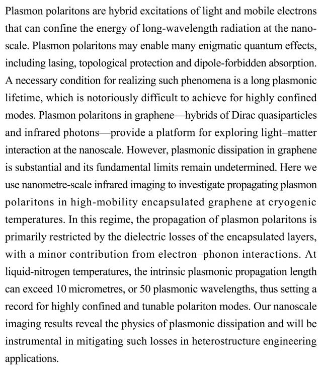 (导读 卓思琪)石墨烯中的等离子体激元为探索纳米尺度下光-物质相互作用提供了平台,但石墨烯中等离子体激元能量损失大且其对光场的限域作用仍未明确。本研究利用纳米级红外成像,对低温下高迁移性石墨烯中激发的等离子体激元进行了研究,实现了低能量条件下对光场的紧密限域。有助于减少异质结构器件中的能量损失。