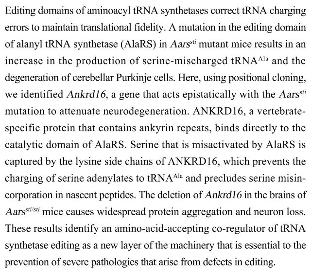 (导读:阿金)丙氨酰-tRNA合成酶(AlaRS)编辑结构域突变产生丝氨酸编辑错误错配的 tRNAAla,致使小脑浦肯野细胞(Purkinje cells)机能退化。本研究使用定位克隆技术识别出 Ankrd16基因,该基因表达的蛋白可捕捉被 AlaRS 错误激活的丝氨酸,防止其不正确地结合新生肽链。去除Ankrd16的 Aarssti/sti 病变小鼠大脑出现大面积蛋白质聚集和神经元丢失。该结果有助于了解由编辑缺陷导致的神经退行性疾病的潜在病理。