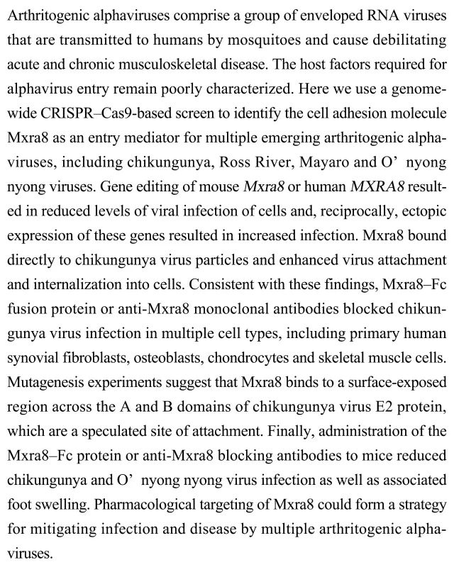 (导读:张铭函)关节炎甲病毒是一组有包膜的RNA病毒,通过蚊子传播导致急慢性关节炎。本研究利用全基因组筛查识别出Mxra8 是多种致关节炎甲病毒的入侵媒介,并通过编辑鼠与人的Mxra8减少了细胞的病毒感染。此发现为减少多种关节炎感染提供了药理学新策略。