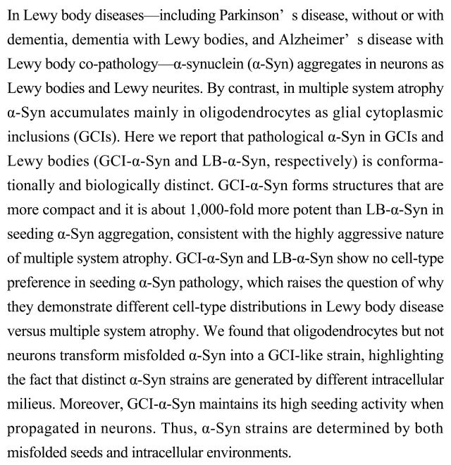 (导读:阿金)在不同类型的神经系统疾病中,α-突触核蛋白(α-Syn)会形成路易体(LB)或神经胶质细胞质内含体(GCI)等不同形式的神经元内聚集。本研究报道了病理性α-Syn在GCI和LB中的形态和生物学特性差异。GCI-α-Syn结构更紧凑,比后者的蛋白聚集潜力高出1000倍。细胞外环境和蛋白质错误折叠成核的差异决定α-Syn聚集形式的差异。