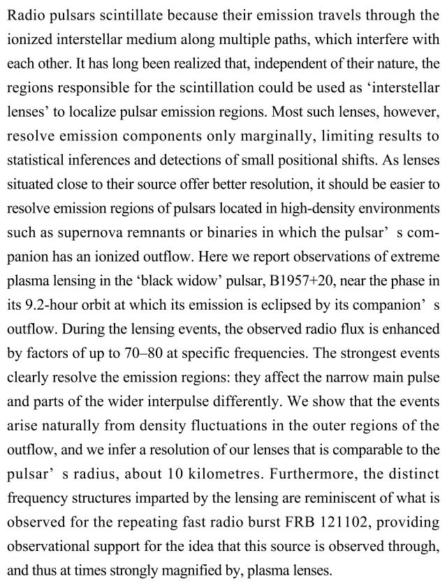 (导读 雷鸣)本研究报道黑寡妇脉冲星B1957+20被其伴星遮蔽时,伴星等离子外流气体产生透镜效应,使脉冲射流放大70-80倍,并清晰解析对狭窄主脉冲和宽广中介脉冲产生不同影响的放射区域。如此显著的频率结构与循环快速射电暴FRB 121102相似,为研究快速射电暴提供了新思路。
