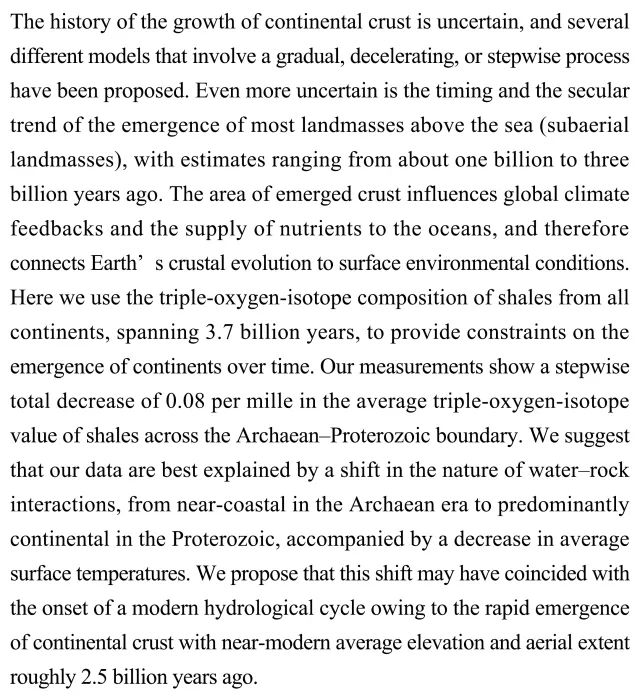 (导读 卓思琪)本研究利用37亿年间各大洲页岩三氧同位素组分推断陆地出现时间,结果表明太古代-元古代边界三氧同位素均值呈每英里0.08下降,最可能因为水岩作用性质转变伴随地表温度下降。这一转变可能与25亿年前陆地迅速出现引起的现代水文循环起始相符。