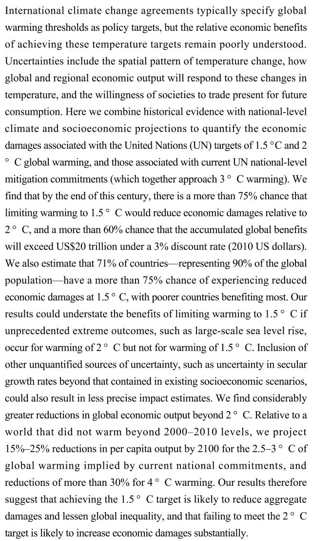(导读 张晶淼)国际气候变化协定常以全球变暖阈值为政策目标,但达到目标的相关经济效益尚不明确。本研究利用历史证据结合国家气候和社会经济计划数据估算,发现实现气温升高1.5 °C以内的目标很大可能会减少全球总损失并减轻全球不平等,若不能达到2 °C 的目标,经济损失很可能会大幅度增加。