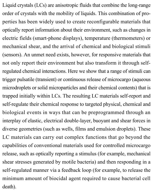 (导读:阿金)液晶被广泛应用于能够以光学方式反馈其环境信息的可重构材料中,但仍无法满足响应性材料的需求。本研究表明一系列刺激可以触发液晶瞬时或连续释放最初捕获的微型容物。该液晶能够对物理、化学和生物事件以化学响应的方式进行自评估和自调节,同时还能执行如以光学形式报告外来刺激等复杂功能。