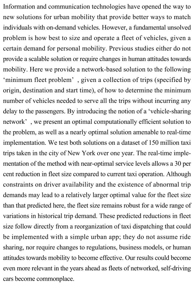 (导读 胡琦琳)本研究引入“车辆共享网络”的概念,为优化出行和减少乘客延误的“最小车队问题”提出了一个在计算上行而有效的最佳解决方案。根据纽约长达一年多的1.5亿次出租车出行数据,并与目前的出租车运营相比,该最优化智能管理可使车队规模减少30%。随着网络化自动驾驶汽车的普及,该成果在未来几年可能更有意义。