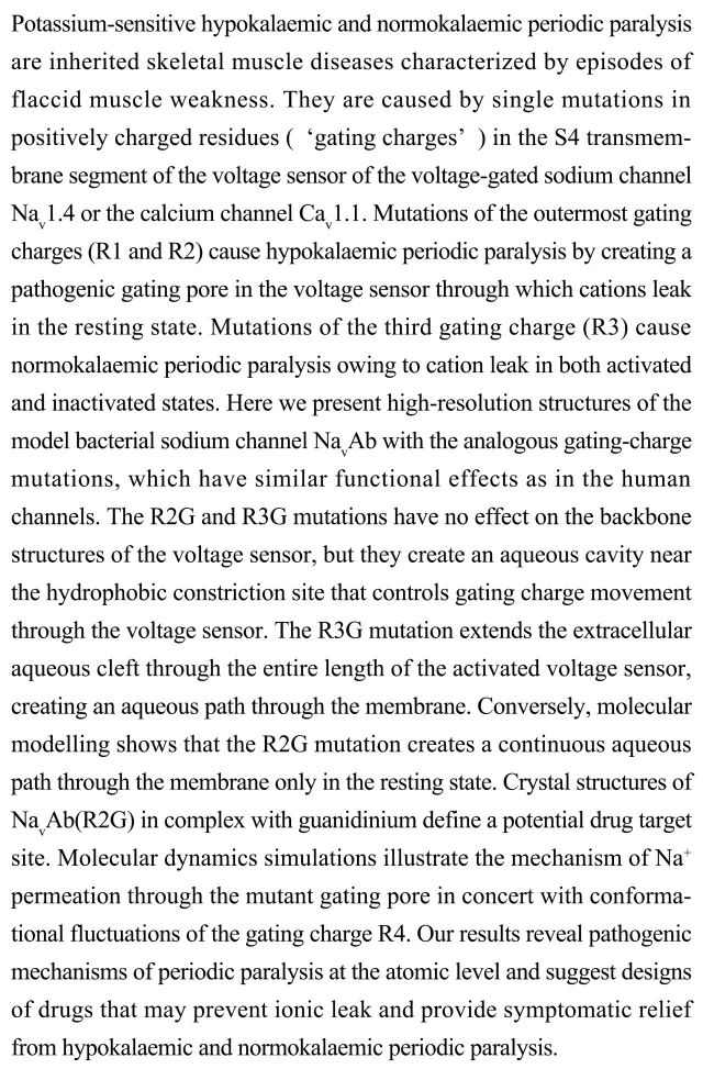 (导读:阿金)钾敏感型低钾血症和常钾型周期性瘫痪是遗传性骨骼肌疾病,由电压门控钾离子通道或钙离子通道的电荷残基突变造成。本研究展示功能类似于人类离子通道的细菌钠离子通道NavAb模型结构。 R2G和 R3G突变在该离子通道的电压感受器附近形成含水空腔,控制门控电荷移动。分子动态模拟显示Na+通过突变门控核心的渗透机制与门控电荷 R4构象变化一致。该结果在原子级别上揭示了周期性瘫痪致病机制,并提出缓解症状的药物设计思路。