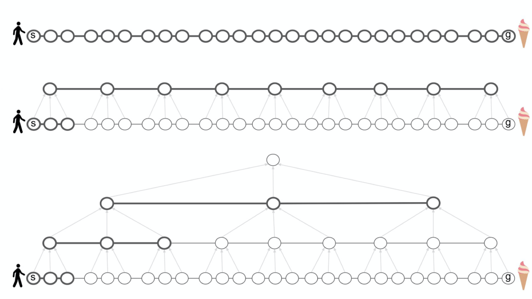 如下图所示,线条较粗的节点和边表示做规划必须考虑的、停留在短期记忆内的内容,用于对规划进行计算,而灰色箭头则表示簇的成员。我们观察到,在低级别图 G 中规划如何从状态 s 到状态 g 至少要花费与实际执行计划(下图上方)一样多的步骤,引入高级图 H 可以缓解此问题,从而降低计算成本(下图中间) ,同时扩展层次结构递归(hierarchy recursive),进一步减少规划所需的时间和记忆量(下图底部)。