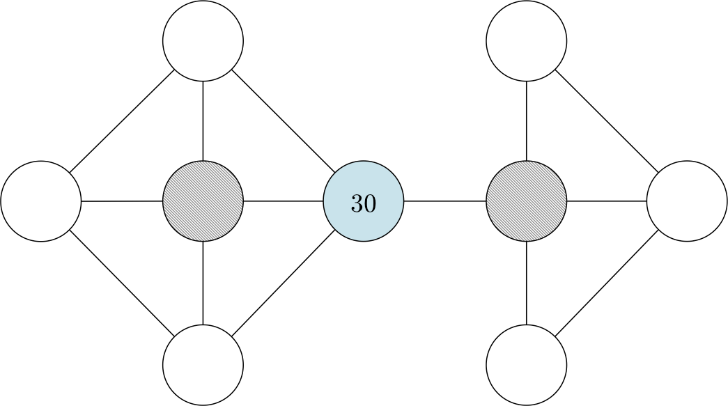 假设你在一个巨大的金矿里工作。金矿由多个独立矿山和隧道组成。金矿的布局如下图所示(每个圆圈代表一个矿井,每条线代表一条隧道)。你的薪酬按日结算,而且当天每发现1克黄金就会获得10美元的报酬。你每天只挖一个矿,并记录下当天的黄金产量(以克为单位)。在过去的几个月里,你发现平均每个矿每天产出约15克黄金。昨天你挖了下图所示的蓝色矿井,获得了30克黄金。那么,对于图中的两个灰色矿井,今天你要选择挖哪一个?请圈出你选择的矿井。