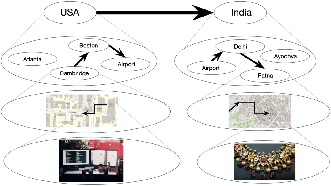 上图是一个层次规划的示例,即某人如何计划从剑桥的办公室出发去购买一件在印度巴特纳的梦幻婚纱。椭圆表示状态,箭头表示在状态之间转换的操作。下方的每个椭圆代表一组较低级别的状态。较粗的箭头表示高级状态之间的转换,人类往往先想到这些概念。