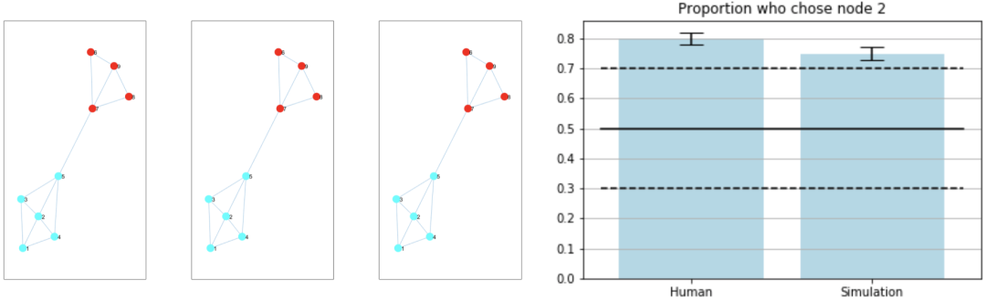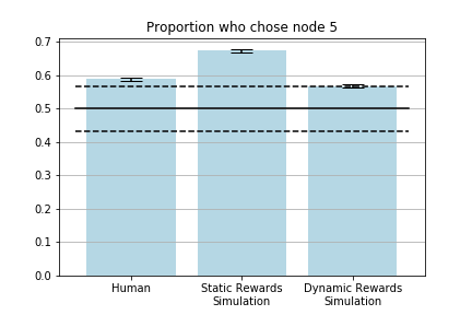 上面的柱状图将被选路径的第二个节点是节点5的人类和仿真参与者的比例可视化。黑色实线表示在给定空假设时的预期比例,黑色虚线表示第10和第90个百分位。