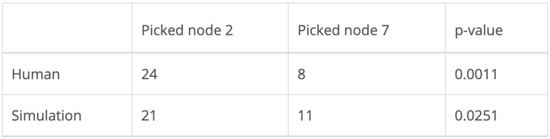 下表中列出的 p 值经右尾二项检验(right-tailed binomial test)计算获得,其中null值在选择左边或右边的灰色节点时被假设为二项分布。显著性水平取0.05,人类实验结果和模型结果均具有统计学意义。