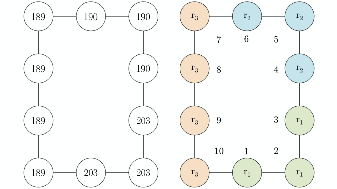 将下图(左侧部分)展现给参与者。与之前的实验一样,为了控制潜在的左右非对称性,我们给参与者随机分配同一图中的布局构造或水平翻转版本,还描述了预期催生出的状态簇,节点编号供参考(右侧部分)。