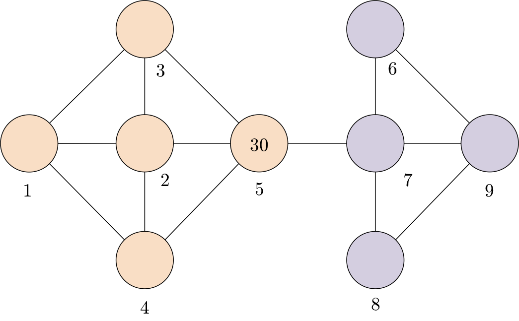 我们希望大多数参与者自动识别以下状态簇(桃黄色和淡紫色的节点分别表示不同的状态簇),并根据脑海里的状态簇决定选择哪个矿井。我们假设,参与者会选择桃黄色的节点而不是淡紫色节点,因为带有标签30、比平均奖励大得多的节点便位于桃红色的状态簇中。