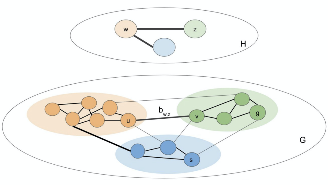 我们将可观察的环境表示为图 G =(V,E),潜在分层表示为图H。G和H均为未加权的无向图。图H包含了状态簇(图G中的每个低级节点都恰好属于图H中的一个簇)以及连接这些簇的桥(bridge)或高级边。只有当某些 v,v'∈V 之间存在边,形成v∈k 和 v'∈k' 时,簇 k 和 k' 之间才能存在桥,比如图H中的每一条高级边在图G中都有一条相对应的低级边。