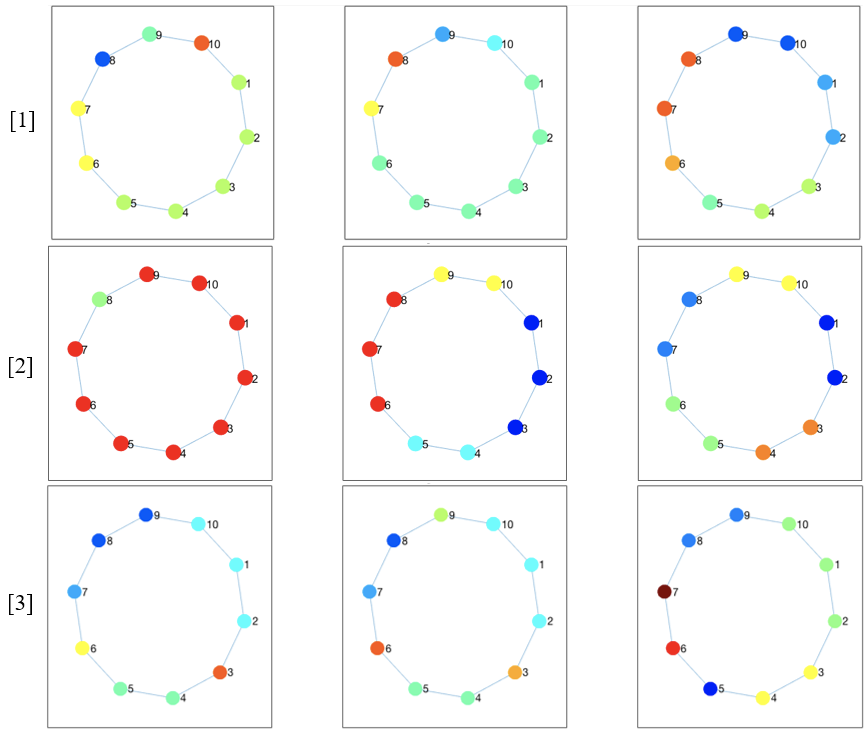 在每次试验中,奖励值的变化概率为0.2,新的奖励值从区间[0,300]中随机抽取。然而,奖励的分组在试验中保持不变:节点1、2和3的奖励值始终只有一个,节点4、5和6的奖励值不同,节点7、8、9和10有第三个奖励值。
