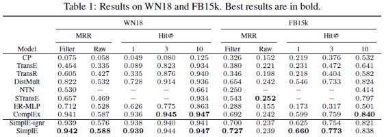 作者与WN18和FB15K在两个基准数据集上进行了比较,结果显示了SimplE都取得了较好的效果。