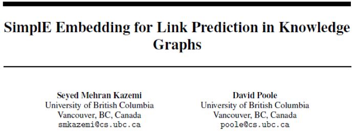链接:https://papers.nips.cc/paper/7682-simple-embedding-for-link-prediction-in-knowledge-graphs.pdf