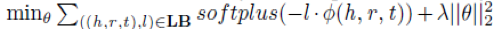 4. SimplE 模型的学习过程:训练中使用随机梯度下降,返利生成方法和 TransE 相同。优化目标为带L2正则化的负对数似然函数:
