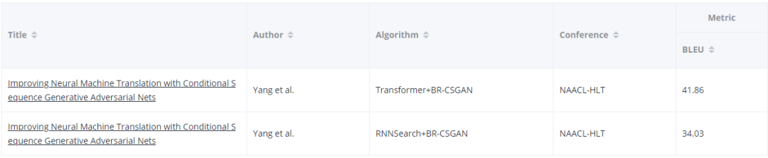 此外,算法描述也能提供一个简要的理解。例如在机器翻译中的 NIST05 (Chinese-English) 数据集上,当前最优的论文可以视为结合了 Transformer 与 CSGAN。算法简述与其所投的的大会能让我们在最短的时间内对该论文有一个直观了解: