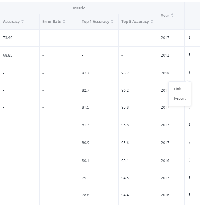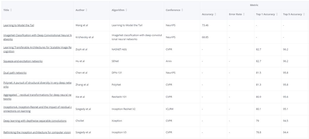 从这里的数据来看,作者收集了多种分类指标,包括准确率、误差率、top-1 准确率和 top-5 准确率,并分离地进行排序。
