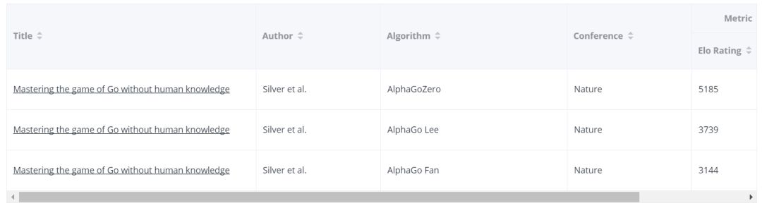 当然,这里收录的 SOTA 结果也不全包含最新的。比如,依次点击「Game Playing」、「Abstract-Strategy」、「Go」之后,你将看到如下结果: