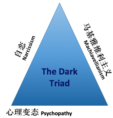 正因为如此,德洛伊·保赫斯(Delroy L. Paulhus)和凯文·威廉斯(Kevin M. Williams)的“人性黑暗三角”理论2002年一问世,便得到了大量关注。这个“臭名昭著”的黑暗三角,包括自恋(narcissism)、马基雅维利主义(Machiavellianism)和心理变态(psychopathy)。