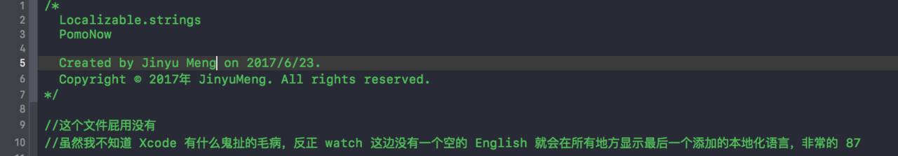 一般来讲,除 Storyboard 外,我们是不需要提供未翻译的语言文件的,因为在调用字符串的语句中就已经包含了未翻译的字符串。一条典型的语句如下:(这个「Time to work!」就是原文。)