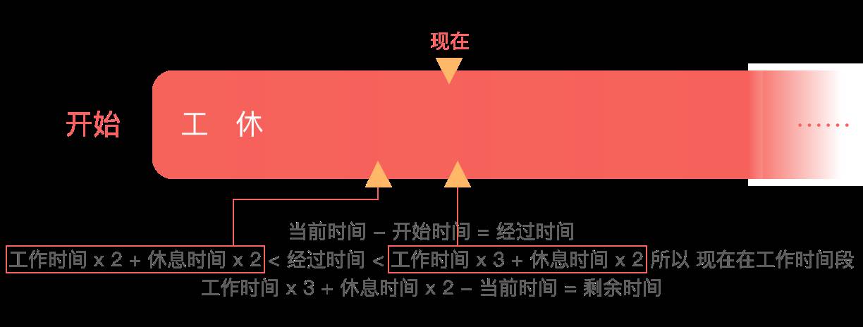 这样一来就不会受后台冻结的影响了。因为时间是根据目标时间减去当前时间实时计算出来的。我们也可以通过把时间分成块来计算现在处在「工作时间段」还是「休息时间段」。