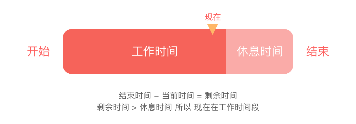 按照上图的思路,从前向后一个格子一个格子的扫描,在「当前时间」的指针进入我们扫描到的格子之后,我们就清楚的知道现在在工作还是在休息,以及还有多长时间了。