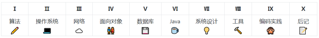 该项目的主体内容可分为 9 部分,其中算法介绍了基础的栈和队列、并查集、排序和查找等,操作系统介绍了现代计算机系统与 Linux 系统。其它如介绍了设计模式和基本思想的面向对象编程、世界上最先进的分布式版本控制系统 Git、以及 Java 和编程实践等都有涉及。