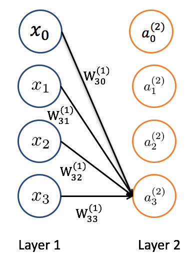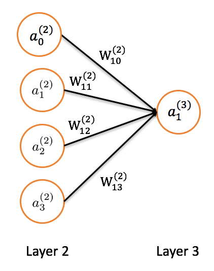 符号定好之后,就可以按照单个神经元的加权求和的方法写出中间层每个单元的计算公式,我们直接在中间层的节点上写出当前神经元的输出 ,注意 是偏置单元,不连接上一层的输出: