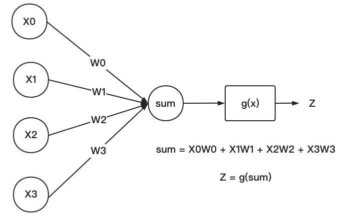 科学家们通过模拟人脑中的神经元结构,设计出了能在计算机中表示的单个人工神经元,结构如下: