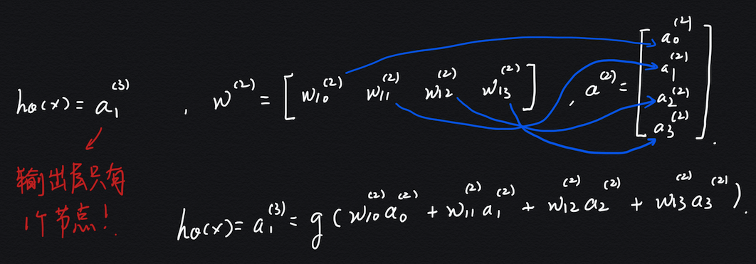 可以看到第二层的每个神经元的值都与第一层所有神经元输出有关。相应地输出层计算公式也类似,要注意输出层只有一个节点哦,所以 是 1 X 3 大小: