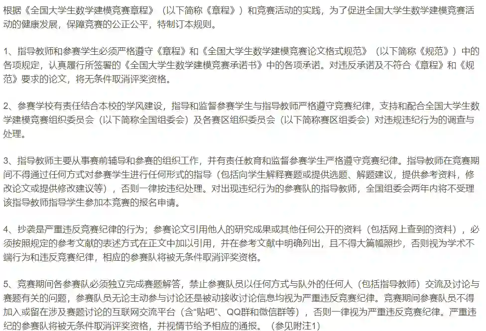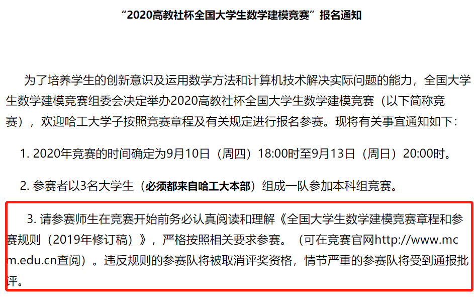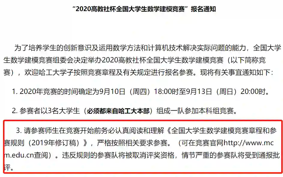 此前,在 6 月 17 日,哈工大发布了“2020高教社杯全国大学生数学建模竞赛”的报名通知,其中提及:请参赛师生在竞赛开始前务必认真阅读和理解《全国大学生数学建模竞赛章程和参赛规则(2019年修订稿)》,严格按照相关要求参赛。
