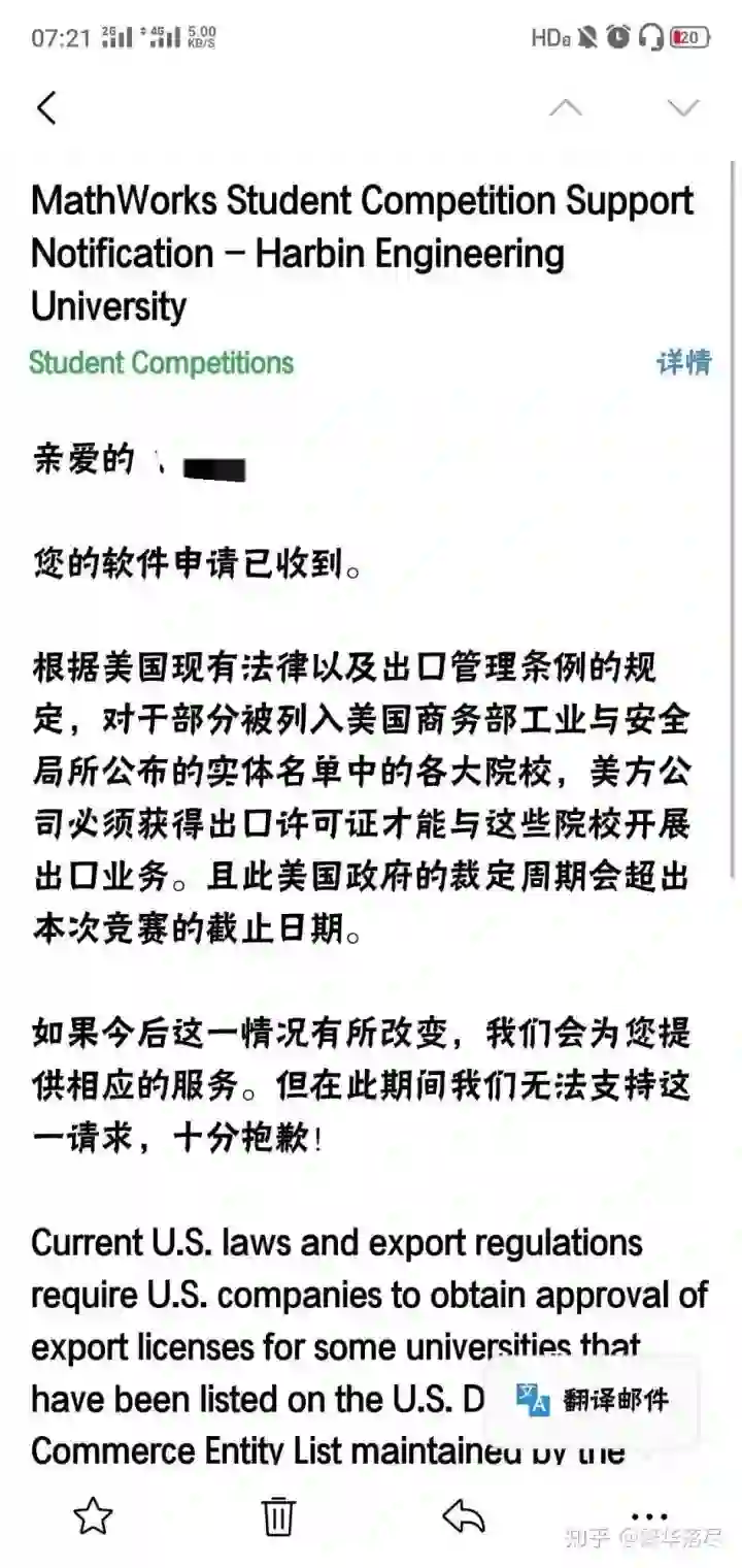 紧接着,在 6 月份,受该实体清单的影响,著名工业软件公司 Mathwork 宣布停止对哈尔滨工业大学、哈尔滨工程大学等在实体清单上的公司提供技术以及客户支持服务,这当中就包含了商业软件 MATLAB。