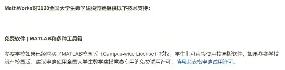 另外,值得一提的是,Mathwork 还是本次全国大学生数学建模竞赛的赞助商之一。而就在 7 月 5 日,大赛官网还发布过一则《MathWorks对2020全国大学生数学建模竞赛提供技术支持的公告》,并表示,将提供 MATLAB 校园版授权。