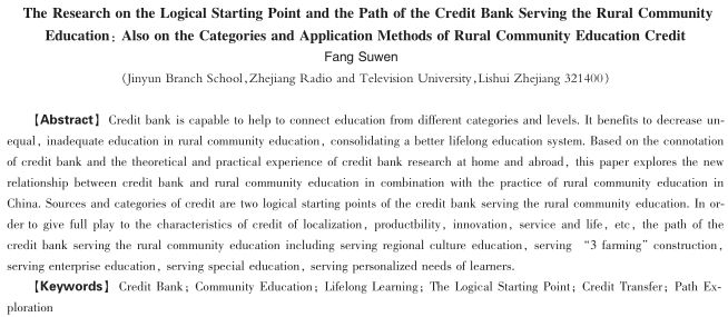 农村社区教育具有区域特点和地方特色,是“农村社区教育学分银行”经验和理论的重要探索基地与突破口。因此,本文以农村社区教育为切入点,探索区域学分银行的理论和实践,具有一定理论意义和实践价值。