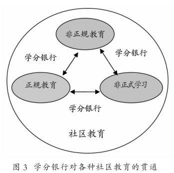 可见,社区教育方式的灵活性、多样性和创新性,充分满足了学习者的学习需求。学分银行以终身教育的理念整合正规教育、非正规教育、非正式学习等各种形式的学习活动,是各级各类教育的“连接点”和“融通点”,给社区教育形式的多元化创造了前提(见图3)。也就是说,通过学分银行,有效链接与贯通了各种教育,促进了社区教育方式更加灵活多样。