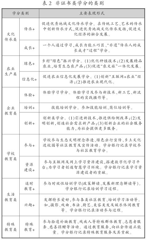 “学习是指个人通过经历、实践、研究和参加教育活动,在信息、知识、理解力、态度、价值观、技能、能力或者行动方面的获取和调整[22]”。一个人的学习具有极丰富的内涵和外延,所谓“腹有诗书气自华”“近朱者赤,近墨者黑”等,表现出学习途径与学习成果的多样性和丰富性。其中,学习者个人在工作生活、生产劳动、娱乐休闲中提高自身素养(升级价值观,产生获得感、成就感等)的过程,是很难“量化”并被证书记载的,但实际上又对一个人产生了积极“影响”。学分银行记录学习者通过非正式学习、环境潜移默化的“影响”而得到提升的“过程”,并将这类学分归为非证书类学分。相对于整个学习历程来说,非证书类学分表现出阶段性、过程性,对学习者个人而言,具有参与性、成长性、发展性和分享感、收获感等特点(见表2)。