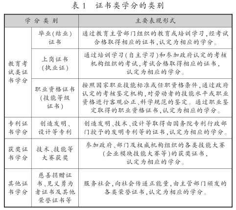 学习者在参与各级各类教育、培训、实践及其他途径的学习活动过程中,通过权威机构组织考试、竞赛及其他方式的评估所取得的各级各类证书,主要包含职业资格(技能等级)证书、毕业(结业)证书、专利证书、获奖证书、慈善捐赠证书等。证书类学分对应机构所颁发的各级各类证书,认定为相应的学分(见表1)。与非证书类学分相比,证书类学分更倾向于证书记载的“成果”,具有结果性、权威性等特点。