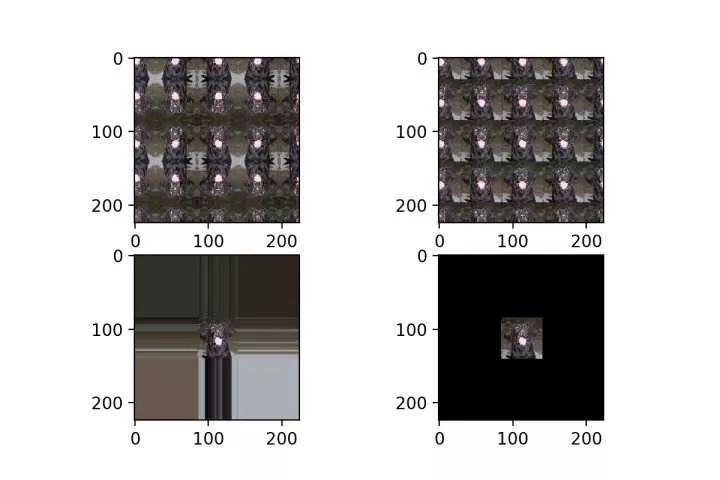 fill_mode为填充模式,如前面提到,当对图片进行平移、放缩、错切等操作时,图片中会出现一些缺失的地方,那这些缺失的地方该用什么方式补全呢?就由fill_mode中的参数确定,包括:“constant”、“nearest”(默认)、“reflect”和“wrap”。这四种填充方式的效果对比如图18所示,从左到右,从上到下分别为:“reflect”、“wrap”、“nearest”、“constant”。