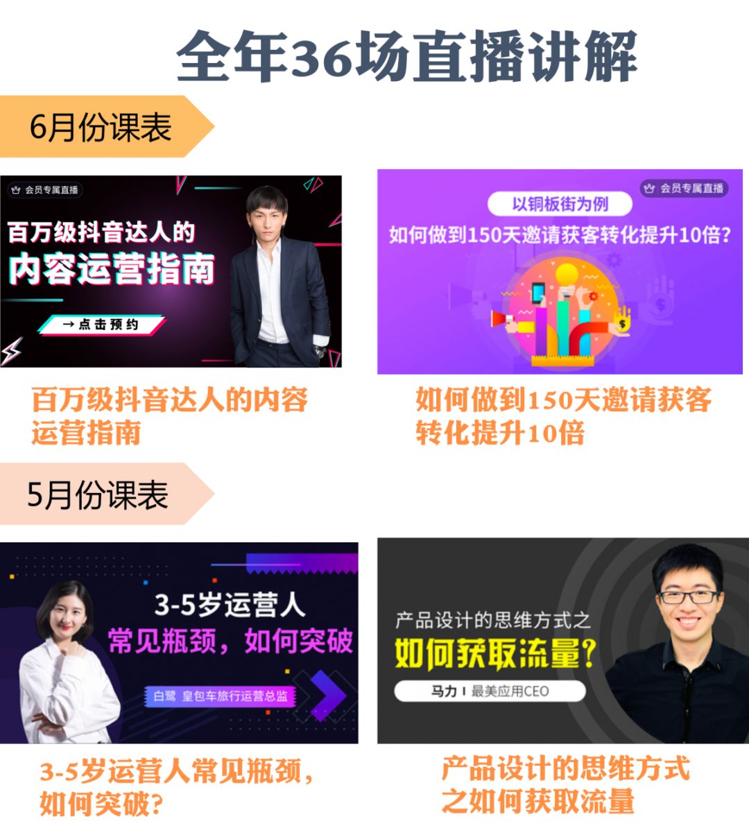 起点学院VIP会员每周一场直播分享,全年会举办36场,请来互联网领域最知名的大咖分享他们的经验,让你即使没人带也能自我提升。