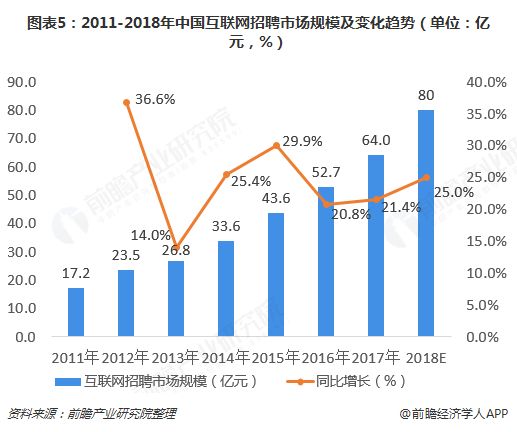 1、互联网行业在飞速发展:数据显示,2011年我国互联网招聘市场为17.2亿元,2018年上升至80亿元,并保持20%-30%的增长率。