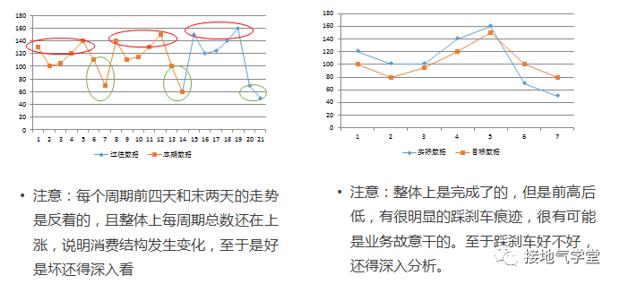 比如下边两种很常见的场景,在整体达标的前提下,内部结构发生了有趣的变化,这种变化到底是好还是坏,会不会眼前看着达标,后边几期数据就不达标,都有可能,这时候就得更深入的分析。